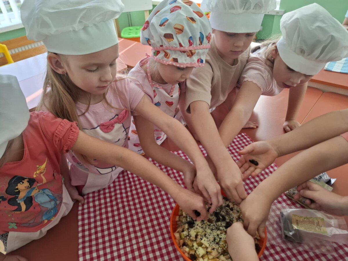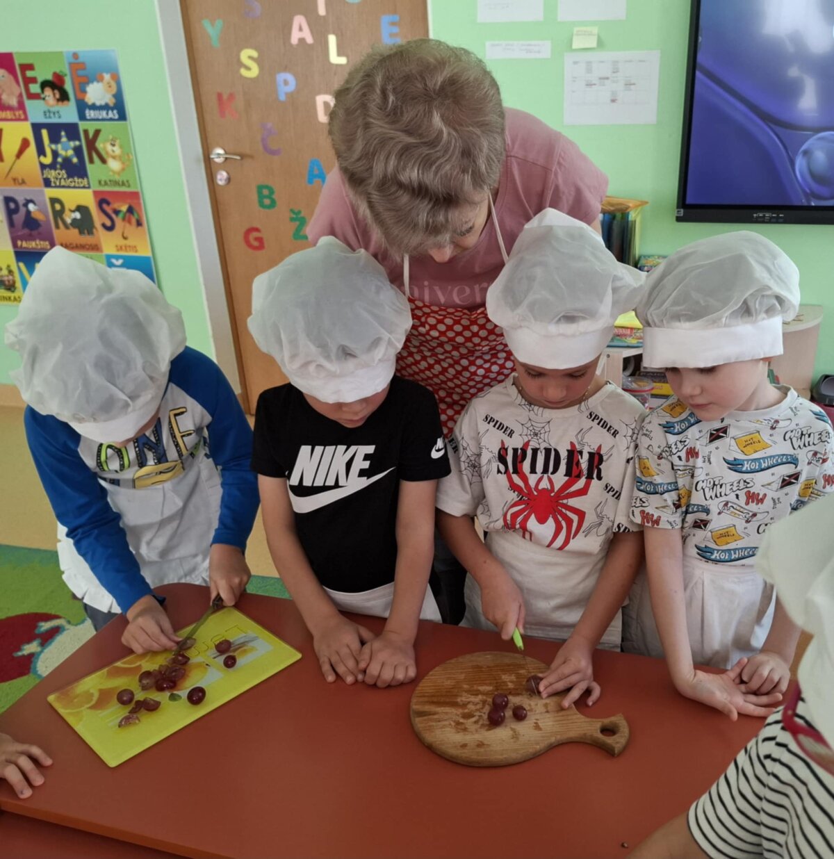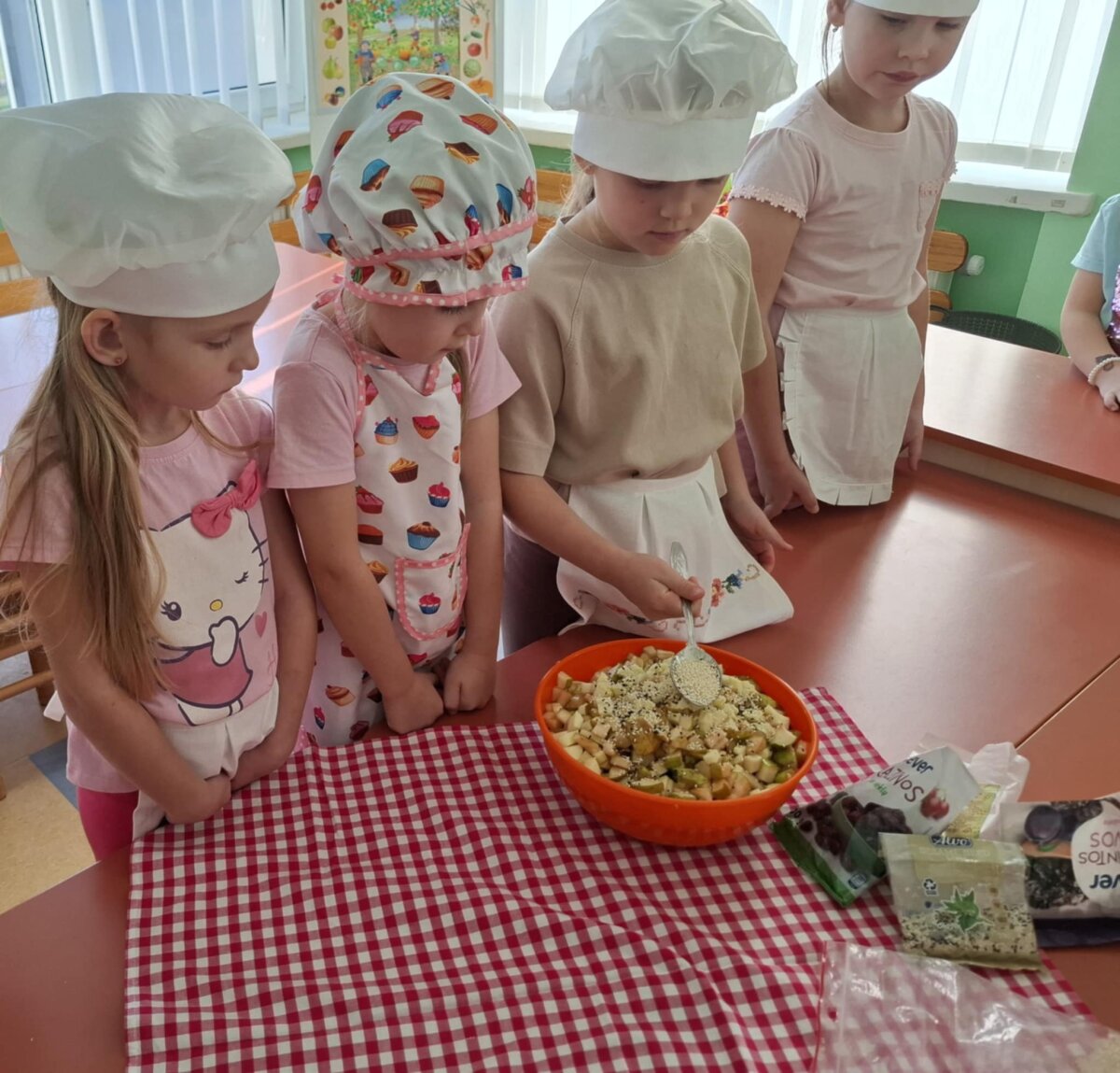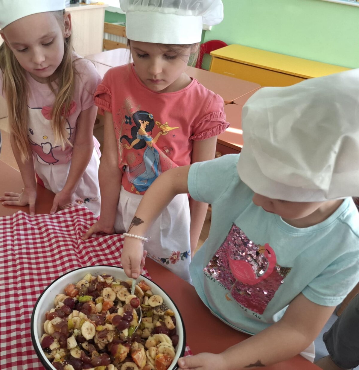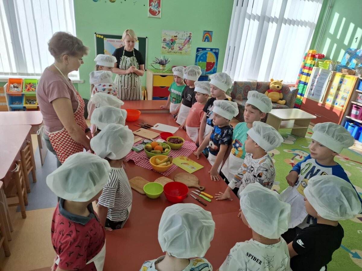 Išklausę naudingų patarimų vaikai patys ėmėsi veiklos – gamino gardžias vaisių salotas. Kiekvienas turėjo savo užduotį: plovė, lupo žieveles, pjaustė spalvingus vaisius. Kai dubenėlyje susitiko visos spalvos, vaikai salotas pabarstė sezamo, šalavijo sėklomis ir razinomis. Visi drauge maišė, juokėsi, uostė, skanavo gardžias vaisių salotas ir džiaugėsi saldžiu jų skoniu. Po tokios veiklos vaikai suprato, kad vaisiai ne tik skanūs, bet ir suteikia daug energijos, geros nuotaikos.