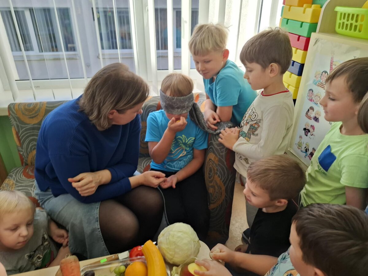 Veiklos pabaigoje vaikai dalyvavo smagiame žaidime ,,Atspėk, ką ragauji?", kurio metu ragavo įvairius vaisius ir daržoves, spėliojo jų pavadinimus, skonį, kvapą.