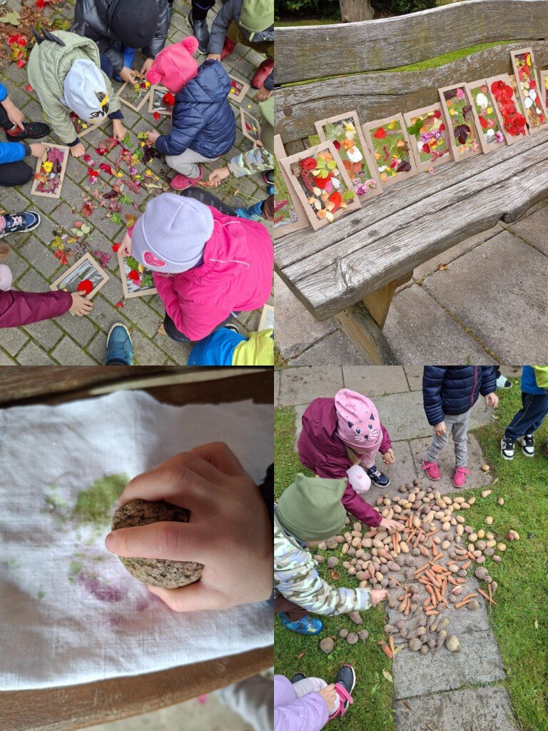 Dar ruduo – puikus metas džiaugtis spalvų gausa. Vaikai su grupės mokytojomis iš vis dar žydinčių gėlių žiedų, rudeninių spalvotų lapų kūrė vitražus ir atsivežę jais papuošė darželio langus. Veiklos metu vaikai sužinojo, kad ir gamtoje, neturint nei teptuko, nei dažų, galima sukurti paveikslus. Čia jiems į pagalbą atėjo surinkti žolynai ir nedidelis akmenukas. Drobinės skiautės pasipuošė gražiausiais raštais.